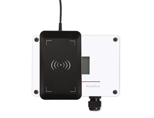 Zařízení řady HygroFlex 5 Advanced (HF5A) jsou vybavena pouze digitálním NFC rozhraním, které slouží ke konfiguraci a správě parametrů. NFC-USB-READER je jediná čtečka schválená výrobcem Rotronic pro tento účel – použití jiných zařízení není podporováno a není na ně poskytována technická podpora.